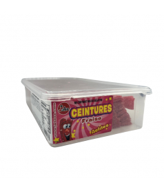 Säure, Fruchtgummi-Streifen mit Erdbeeregeschmack Länge von ca. 25 cm. Erhältlich in Cola, Erdbeere, Kirsche, Apfel, Himbeere und mehrfarbig - Wird in Großpackungen in einer durchsichtigen Kunststoff-Präsentationsbox mit 150 Stück (1200 g) oder in einem kompletten Karton mit 6 x 150 Stück vertrieben.