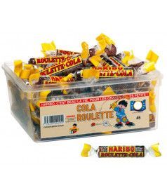 HARIBO - Münzförmiges Cola-Gelatinebonbon, das zu 10 Stück (25 g) eingewickelt ist und in einer Großpackung in einem Viereckdose mit 45 Rollen verkauft wird.