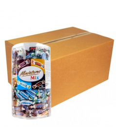 Die berühmten Schokoladen in einer verpackten Mini-Version! Miniature Mix ist eine Mischung aus 4 Mini-Schokoladen: Mars, Bounty, Snickers und Twix – Verkauft in Großpackungen in einer 3-kg-Tube (ca. 296 Stück) oder in einem kompletten Karton mit 3 x 3 kg.