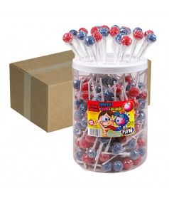 Vendido en envase grande en un expositor de 18 piruletas o en una caja completa de 2 x 18 unidades