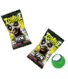 FINI - Bille de chewing-gum fourrée, acidulée et colorante, vendue en gros conditionnement dans un petit carton contenant 12 sachets de 80 grammes